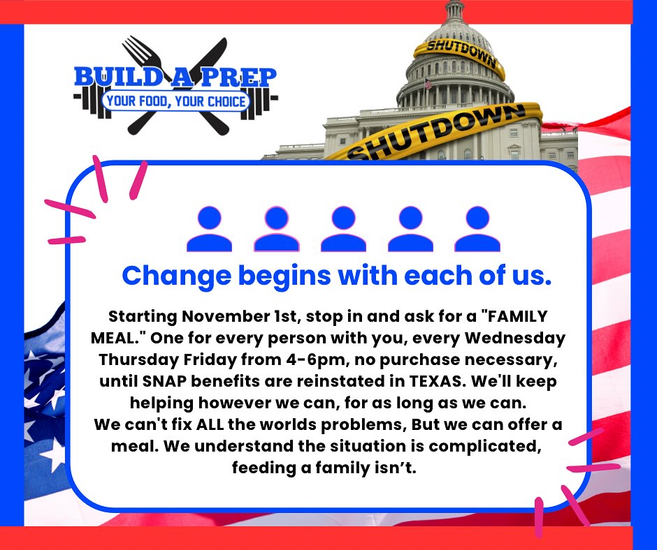 In response to the SNAP (EBT) benefits disruption, BUILD A PREP is providing free dinners to families requiring assistance. Beginning November 1st, please visit us and ask for a ‘FAMILY MEAL.’ We will offer one meal per person, every Tuesday Wednesday, Thursday, and Friday from 4-6pm, with no purchase necessary, until SNAP benefits are reinstated in Texas. All you have to do is show your snap card.